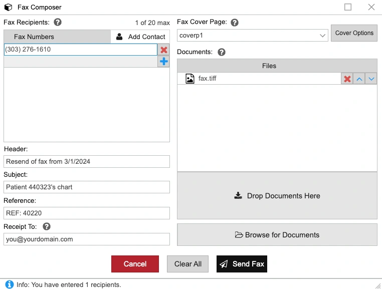The "Send Fax" dialog will appear, pre-filled with the fax number you originally sent the document. You can resend it to the same number, change the recipient, or add additional fax numbers if needed.